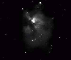 Trifida . Stupendo oggetto per telescopi di discreto diametro, in fotografia rivela tutta la sua straordinaria bellezza soprattutto per le notevoli bande di polvere che lo attraversano . Distanza dell'oggetto : 2.000 a.l. Diametro reale 7 x 5 a.l. . Diametro angolare 11 x 8 primi. . L'immagine e' stata ottenuta dalla somma di 4 pose della durata di 6 minuti ciascuna, successivamente elaborate con stretching guassiano e montate con il programma CCD_IMG. di GianPaolo PIZZETTI . |