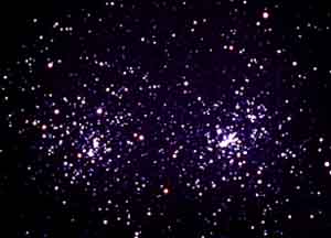 con le Pleiadi. Visto le dimensioni è impossibile riprendere questo oggetto con l'ausilio di riprese CCD. L'immagine è stata ottenuta con la fotografia tradizionale utilizzando l'ottima pellicola AGFA 1000 Professional e successivamente passata allo scanner. La dimensioni dell'immagine è di circa 47 primi d'arco nel senso della lunghezza Entrambi sono di magnitudine integrata circa 4/4.5 Distanza : 7.000-7.500 a.l. Diametro reale : 65 a.l. Età : 5,5 Milioni d'anni (NGC869 a destra) - 3,2 Milioni d'anni (NGC884 a sinistra) Immagine tratta dall'archivio dell'Osservatorio |